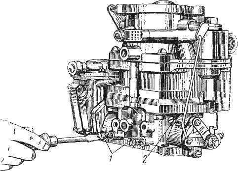При регулировании винтами 1 нужно постоянно следить за показаниями тахометра и газоанализатора. Частота вращения коленчатого вала должна быть постоянной в заданных пределах и поддерживаться регулированием с помощью упорного винта дроссельных заслонок.