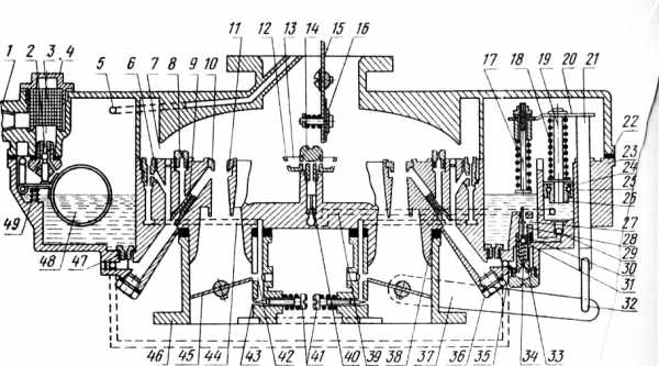 1 — корпус воздушной горловины; 2 — игольчатый клапан; 3 — сетчатый фильтр; 4 — пробка фильтра; 5 — канал балансировки поплавковой камеры; 6 — жиклер холостого хода; 7 — полость; 8 — жиклер полной мощности; 9 — воздушный жиклер; 10 — малый диффузор, 11 — кольцевая щель; 12 — форсунка; 13 — воздушная полость; 14 — полый винт; 15 — воздушная заслонка; 16 — автоматический клапан; 17 — толкатель; 18 и 34 — пружины; 19 и 21 — штоки; 20 — планка; 22— кольцевая канавка; 23 — корпус поплавковой камеры; 24 — манжета; 25 — пружина манжеты; 26 — втулка шока; 27 — отверстие; 28 — промежуточный толкатель; 29 и 31 — шариковые клапаны; 30 — седло; 32 — тяга: 33 — канал экономайзера с механическим приводом, 35 — топливный канал; 36 — пробка: 37 — рычаг; 38 — прокладка; 39 и 44 — каналы; 40 — нагнетательный игольчатый клапан; 41 — винты регулировки холостого хода; 42 — прямоугольное отверстие; 43 — круглое отверстие системы холостого хода; 45 — дроссельная заслонка; 46 — корпус смесительных камер; 47 — главный жиклер; 48 — поплавок; 49 — пружина