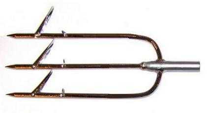 Острога, сделанная по принципу поворотного гарпуна. Это наверняка прототип трезубца атлантов. Принцип поворотного гарпуна был изобретен еще в каменном веке. Тогда его изготавливали из кости. Такое оружие легко входит в тело жертвы, а назад не выходит, так как отросток, укрепленный на шарнире, поворачивается и мешает вытаскивать гарпун из жертвы. Благодаря поворотным гарпунам эскимосы охотились на крупных морских животных — моржей, белух и китов. Фото с сайта: http://sport.wikimart.ru/water/diving/accessories/model/2076836/aksessuary |