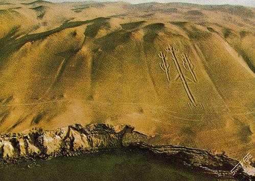 Приморский склон в пустыне Наска в Южной Америке с изображением трезубца. Канделябр Паракаса — так называют этот гигантский трезубец (78 х 125 метров), «нарисованный» на склоне береговой скалы в тихоокеанской бухте Писко, неподалеку от города Паракас в Перу. Кто, когда и зачем сделал это изображение — великая тайна. Хотя можно предположить, что этот знак сделали еще атланты, которые имели здесь колонию.