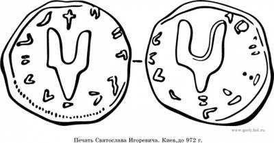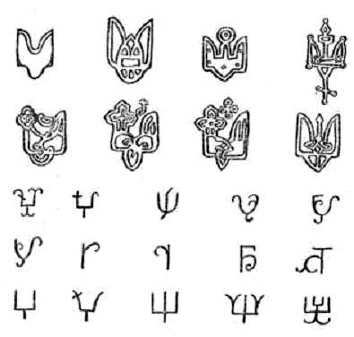 Крёстным отцом названия «трезубец» был Николай Карамзин, который так назвал символ княжеской власти на монетах князей Киевской Руси. Рисунок с сайта: http://uasvoboda.com/index.php?/topic/1518-день-победы/page__st__40__p__40985 |