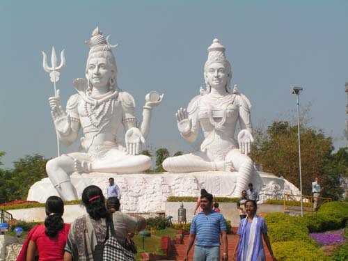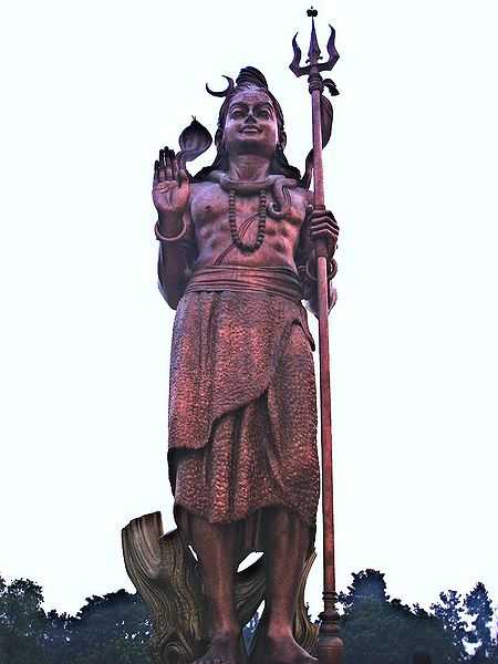 В его многочисленных руках — изогнутый меч, лук, символы власти трезубец и булава. Вместо змей в руке у него цветок, а в другой руке какое-то божественное кушанье. Это — явно не бог войны, не пассионарий. На заднем плане — храм с луковицеобразной главой.