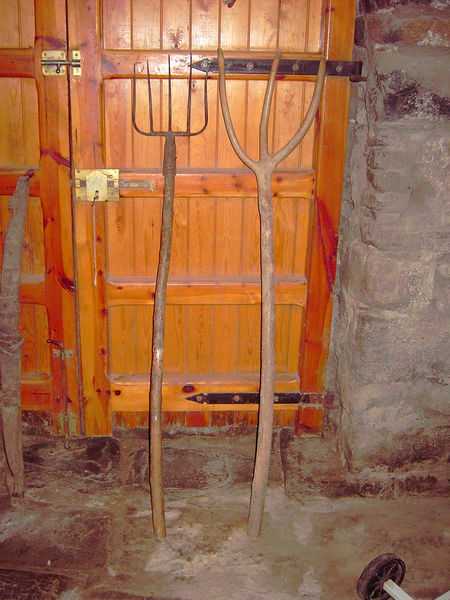 Еще одна разновидность трезубца — вилы деревянные. Используются для собирания сена в копны и стога. Железные вилы с 3 или 4-мя прутьями-зубцами — более позднее изобретение, скорее всего, производное от вил деревянных. В Атлантиде таким орудием вряд ли пользовались. Такие вилы — явно не оружие Посейдона. Фото с сайта «Википедия». |