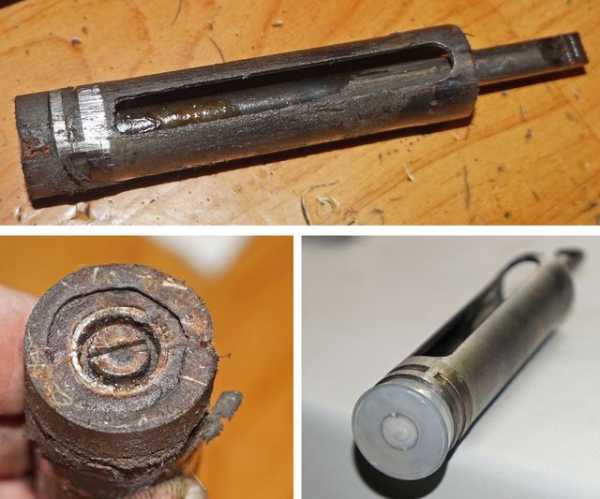 А вот чтобы тяга не царапала цилиндр при взводе, в неё вложен желтый кусок пластика (очень похоже на фторопласт), поэтому по прошествии стольких лет следы эксплуатации в данном месте практически отсутствуют. Вынул я эту пластмасочку и с обратной стороны наклеил полоску изоленты и вставил обратно… теперь она «приподнялась» на 0,2мм и готова работать еще много тысяч выстрелов.