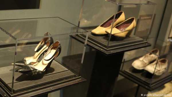 В нескольких витринах выставлены покрытые пылью туфли, ботинки и кроссовки людей, которым удалось спастись.