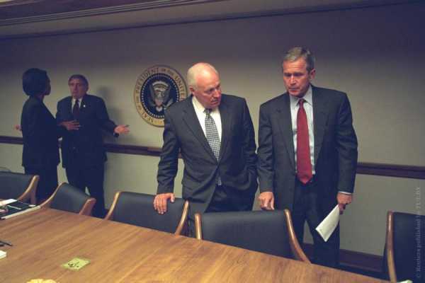 Президент США Джордж Буш заявил, что террористы устроили нападение на башни-близнецы из-за ненависти к свободе и демократии. Только в 2015 году появились снимки, сделанные в центре управления в чрезвычайных ситуациях в Вашингтоне после пары часов как был совершен теракт. На фотографиях запечатлен американский лидер, вице-президент США Дик Чейни, советник по национальной безопасности Кондолиза Райс и старшие сотрудники. Заметим, что Чейни в весьма интересной позе наблюдает за новостями о трагедии.