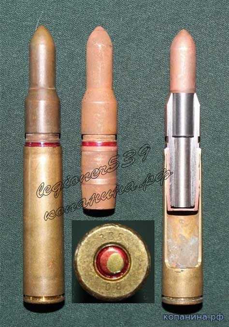 Бронебойная пуля Б-30. Черный носик. Состоит из стальной оболочки, покрытой томпаком, свинцовой рубашки и стального, каленого сердечника. В общем, это увеличенная пуля Б-30 калибра 7,62. Также как и эта пуля опасности не приставляет. Бронебойно-зажигательная пуля Б-32. Черный носик, под ним — красное кольцо. Увеличенная пуля Б-32 калибра 7,62. В носике есть зажигательный состав: Нитрат бария 50% Сплав AM 50% Ну, все тоже только осколков от нее побольше.