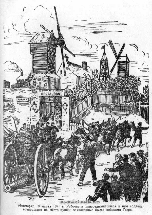 Исторический рисунок, на котором жители Парижа помогают затащить два орудия национальной гвардии на Монмартр.8 февраля 1871 года состоялись выборы в новое национальное собрание. В Париже подавляющим большинством голосов избраны были представители радикальной демократии — Виктор Гюго, Ледрю-Роллен, Флоке, Локруа и другие, обещавшие выступить с требованием децентрализации и свободы общин. Из чистых социалистов, различные фракции которых выставили общий список кандидатов, в депутаты попали лишь немногие, в том числе «мютюалисты» Толен и Малон. Провинция послала в национальное собрание большей частью лиц, склонных к восстановлению монархии в той или иной форме. Главой правительства избран был Тьер.