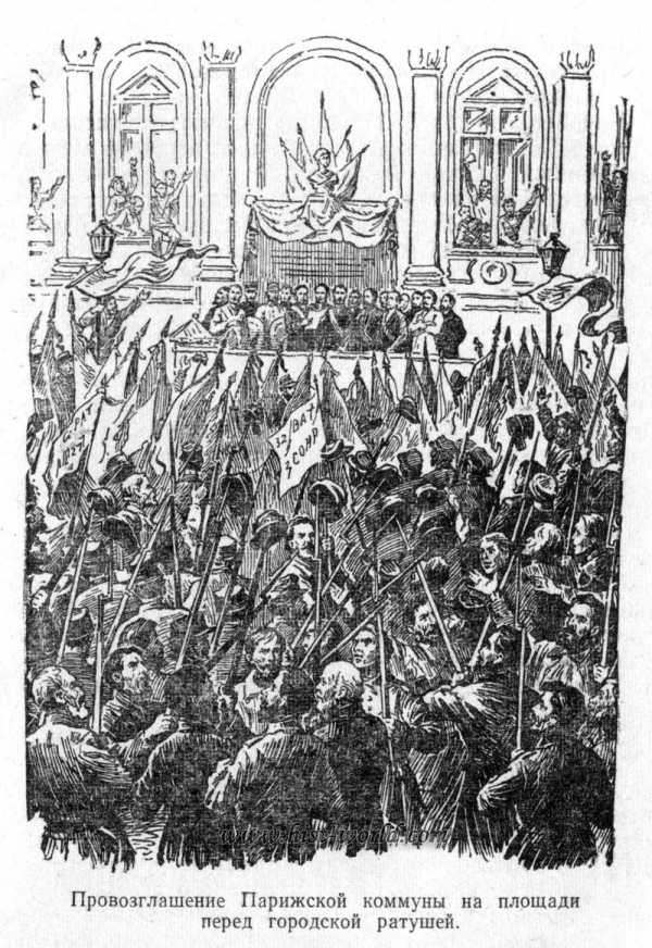 Тогда-то проявилось и громко заявило о себе стремление к учреждению коммуны, в которой видели панацею от всех зол и бедствий, обрушившихся на Францию. У одних требование коммуны имело значение простого протеста против невыносимой централизации управления, усилившейся при Наполеоне III. Другие выдвигали традиции первой революции, когда парижская коммуна руководила победоносной борьбой с коалицией держав. Приверженцы Прудона мечтали о разложении Франции на ряд автономных общин, из которых каждая самостоятельно определяла бы свой хозяйственный быт и ввела бы своих членов в обетованную страну «мютюализма». Наконец, идея коммуны встретила большое сочувствие и у революционеров-коммунистов, глава которых, Бланки, лично явился тогда в Париж.