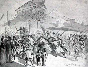 Расстрел генералов Леконта и Клеман-Тома их же восставшими солдатами. Постановочная реконструкцияАрмейские части по всему городу стали присоединяться к восстанию, что вынудило Тьера поспешно вывести из столицы в Версаль оставшиеся верными войска, полицию, административных работников и специалистов.