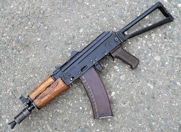 14. Румынский AIMS 74. Этот вариант PM md. 63 под патрон 5,45×39мм также имеет деревянную переднюю вертикальную рукоятку и складывающийся вбок металлический приклад. Для уменьшения отдачи установлен дульный тормоз-компенсатор как у АК-74.