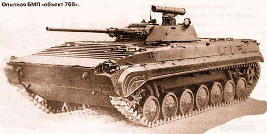 В КБ Челябинского тракторного завода под руководством П.П. Исакова первоначально отрабатывался проект гусеничной боевой машины «объект 764», выполненной на основе шасси опытного полярного вездехода (может отсюда и пошла знаменитая байка о женщине-конструкторе? — Прим. автора). В предлагаемой машине моторно-трансмиссионное отделение располагалось в передней ее части посредине, за ним располагались отделение управления, боевое и десантное отделения. Выход десанта из машины предусматривался через кормовые двери и через люки в крыше корпуса. Для движения машины на плаву предусматривалась установка двух водометных движителей. Боевое отделение с комплексом вооружения такое же, как и на всех других проектах, представленных на конкурс. Однако этот проект челябинских конструкторов не прошел. Он был доработан, причем некоторые моменты были позаимствованы от проектов других КБ.
