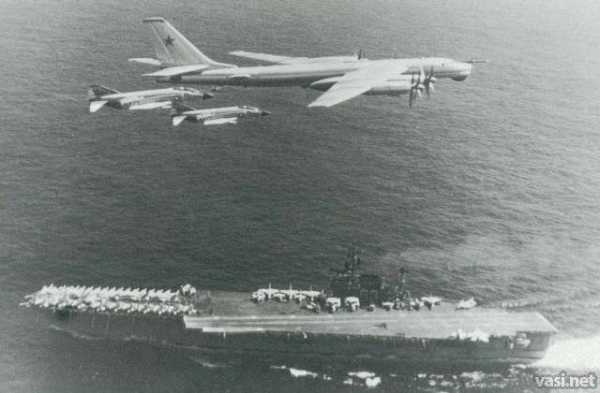 Vought F-8J Crusader из эскадрильи VF-194 Red Lightnings оттесняет Ту-95 от авианосца USS Oriskany (CVA-34). 25 мая 1974 г.