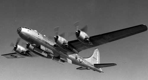 Стратегический бомбардировщик B-29. Макс. взлетная масса 63 тонны. Максимальная скорость 570 км/ч. Боевой радиус 3400 км. Практический потолок 12 000 м. Экипаж 11 человек. Боевая нагрузка: максимальная 9 тонн, нормальная 4,5 тонны. Оборонительное вооружение: 12 крупнокалиберных пулеметов.