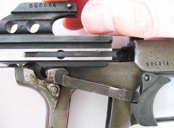 Интересным решением было объединение функций боевой и возвратной пружины в одной детали. Пружина, расположенная над стволом работала на сжатие как возвратная и как боевая.