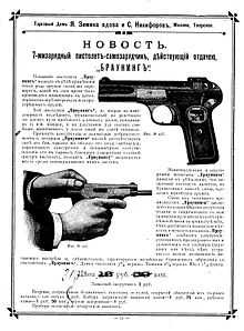 Огромной популярностью FN Browning model 1900 пользовался и в России, где чаще именовался как Браунинг №1. Офицерам царской армии и флота разрешалось в частном порядке приобретать и носить это оружие. Модель 1900 имела перед Наганом огромное и решающее преимущество в быстроте перезарядки, не говоря уже о габаритах и массе, а так же о величине усилия спуска, напрямую влияющей на точность стрельбы. Однако самое широкое распространение, как и во всем мире, Браунинг получил в качестве гражданского оружия. Он использовался жандармерией и работниками почты. Этот небольшой и удобный пистолет из-за своих малых габаритов часто использовался различными террористическими организациями. К примеру, именно из Браунинга 1900 террористом был убит Петр Столыпин 1 сентября 1911 года. А позже, уже после большевистского переворота, из Браунинга модели 1900, по официальной версии, 30 августа 1912 года Фани Каплан стреляла в В.И. Ленина. Во время Первой мировой войны Браунинги отчасти потеснили состоявшие на вооружение Наганы по той же причине, что и в мирное время.