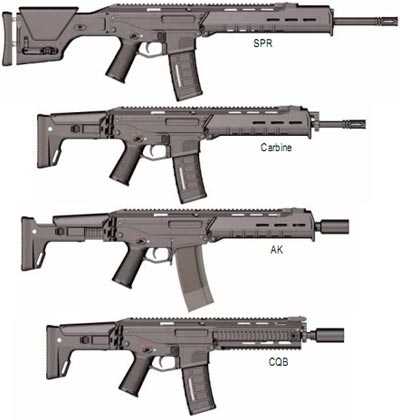 Все модели в настоящее время представлены только в калибре 5.56 mm NATO, но по заявлению производителей возможно дополнение семейства модулями под калибры 7.62х39 мм, 7.62×51мм и 6.8×43 мм (6.8 mm Remington SPC).