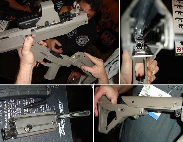 Так же продублированы с левой стороны оружия и остальные элементы управления, защелка магазина и кнопка затворной задержки. Приемник магазина предназначен для стандартизированных в рамках НАТО магазинов от М16.