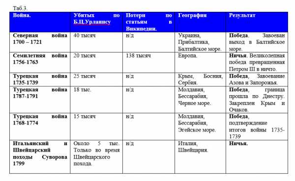 Из 10 конфликтов в 5 решалась судьба России: Великая отечественная, Первая мировая, Отечественная война с Наполеоном, Польская 1604-1618 гг и Крымская 1571-1572. Еще двух случаях, конфликт затянулся на десятилетия и привел к существенным изменениям в российском обществе: Ливонская война 1558-1583 и Северная война 1700-1721 (в обоих случаях наблюдалось сокращение населения страны, в отличие от прочих периодов XVI и XIIX веков соответственно).