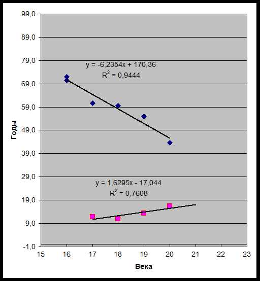 Случайность необходимо сразу отбросить. Если бы войны были распределены случайным образом, величина R2 оказалась меньше 0,18. Математические подробности можно посмотреть у Я.Р.Магнус, П.К.Катышев, А.А.Пересецкий «Эконометрика. Начальный курс». Довольно высокие значения R2, ( 0,94 для одной линии и 0,76 для другой) , однозначно указывают на наличие тренда.
