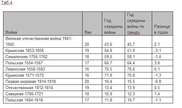 Мы наблюдаем, что даты середин войн в точности лежат на двух прямых линиях тренда . Точность довольно высокая, отклонение ни в одном случае не превосходит 3,6 года. (Таб.4).