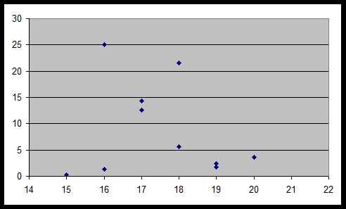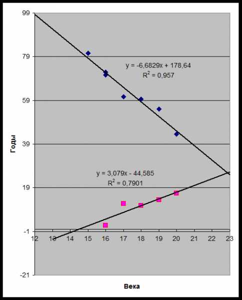 Рис.2. Даты середины крупных войн. (По вертикали отложены года соответствующего века, по горизонтали — века)