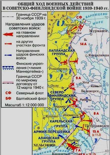 С самого начала войны перевес в силах был на стороне СССР. В наступательной группировке Красной Армии насчитывалось от 450 до 500 тысяч человек, в финской армии – 295 тысяч бойцов. Превосходство советской стороны в авиации, танках и артиллерии было подавляющим. У финнов недоставало боевой техники, особенно средств противовоздушной обороны. Однако советские войска оказались слабо подготовленными к наступательной войне зимой, в трудных условиях преодоления защитных укреплений так называемой линии Маннергейма (построенные финнами мощные фортификационные сооружения, расположенные в основном на Карельском перешейке). В свою очередь финские войска, защищавшие независимость своей страны, проявили высокую стойкость в обороне. В результате вместо двух-трех недель, в течение которых советское военное командование рассчитывало одержать победу, борьба на фронте приняла затяжной характер. За первые два месяца боев, понеся огромные потери, советские войска сумели вклиниться в оборону финнов лишь на 25–65 километров.