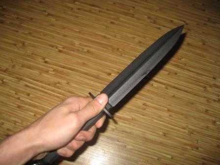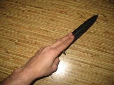 Минусы: Трудно применим на практике. Требует весьма специфического оружия – кинжал с достаточно узкой рукоятью и балансировкой в гарде или рукояти (для ножа фактически неприменим). Почти полная невозможность качественных режущих ударов из «защитного» положения – только лёгкие порезы. Кроме того, даже при небольшой ошибке в удержании, достаточно легко можно травмировать пальцы на собственном же ударе.