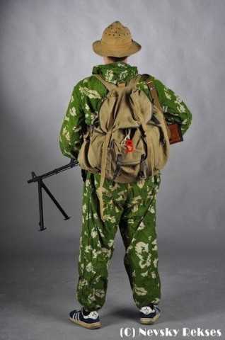 1. Маскировочный комбинезон «Березка». Он же КЗМ-П, принят на снабжение в 1957 г., как дальнейшее развитее маскировочных костюмов времен Великой Отечественной войны. Изначально использовался пограничниками и разведывательными подразделениями. Но со временем приобрел популярность и в других частях Советской армии, в т.ч. среди саперов и десантников.