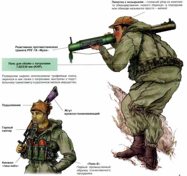Боевая форма разведчиков довольно часто пополнялась предметами трофейного обмундирования, обуви и снаряжения. Судя по радиоперехвату «бандформирований», даже они затруднялись в определении принадлежности «каких-то вооруженных людей, непохожих на «шурави». И неудивительно, т.к. только подразделениям СПЕЦНАЗ разрешалось ведение боевых действий без обязательных для всего личного состава 40 ОА бронежилета и стального шлема (каски), ассоциирующихся у афганцев с внешним видом шурави. Эта единственная привилегия СПЕЦНАЗА вызывала даже зависть у остальных военнослужащих Контингента.