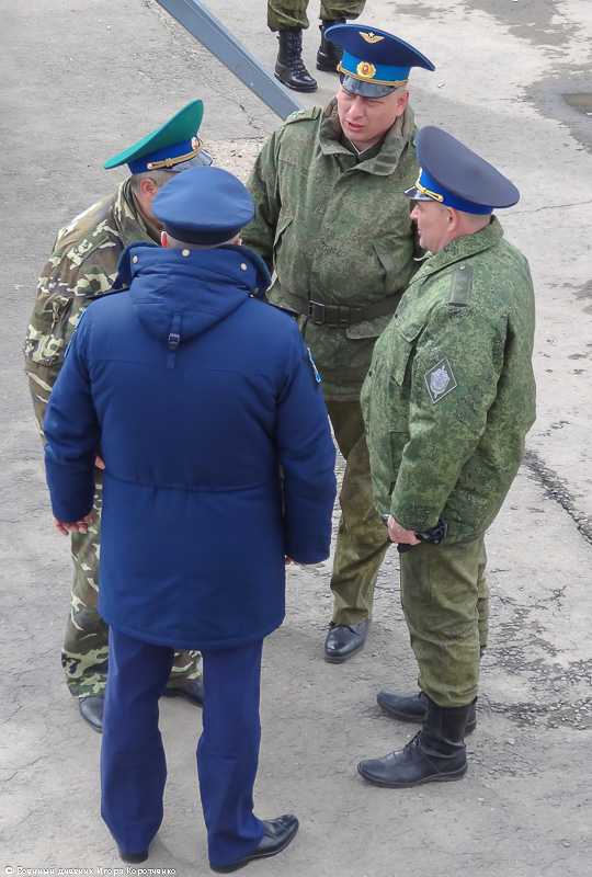 5. В центре — полковник Пограничной службы ФСБ. Традиционная «зеленая фуражка» с васильковым околышем (знак принадлежности Погранслужбы к «большой» Лубянке). Куртка пограничника (она более свободная, видимо для удобства рукопашной схватки при задержании нарушителей границы) по покрою и цветовой гамме отличается как от армейских, так и от эфэсбешных курток.