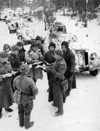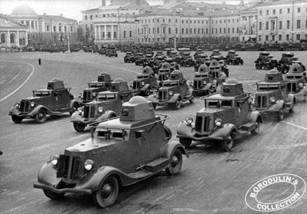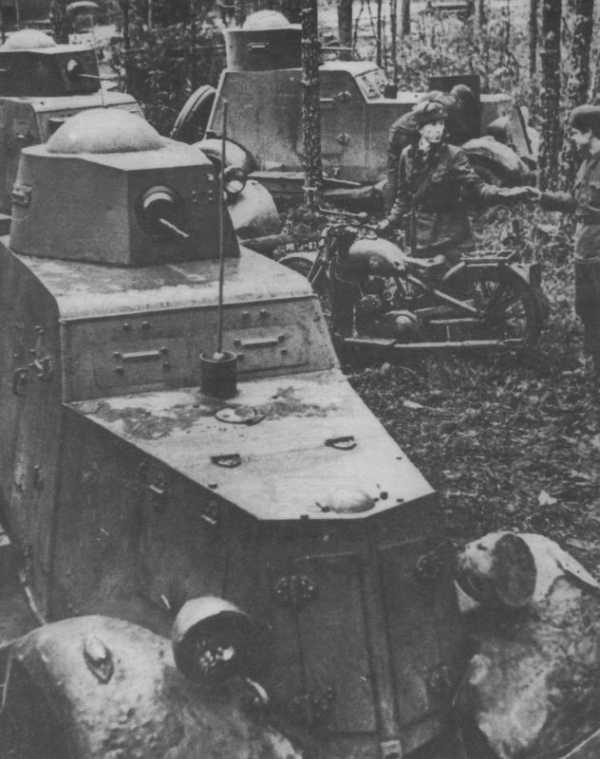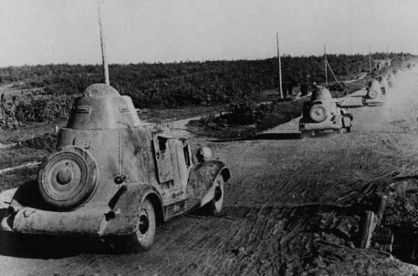 Колонна бронетехники РККА пред отправкой на фронт. На фото запечатлены легкие бронеавтомобили БА-20, причем первый ряд составляют машины, оборудованные радиостанциями 71-ТК-1 с поручневой антенной. Справа, у верхнего среза фото, видна часть танковой колонны, состоящей из танков Т-28 и Т-35