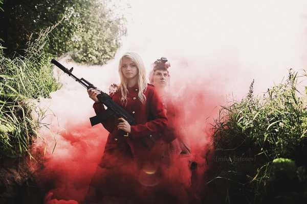 Дым не обязательно должен располагаться именно в кадре. Очень красиво смотрятся фотографии, где шашка с дымом располагается за кадром, а в кадр попадает только сам дым. Такие фотографии довольно оригинальны, но при их съемке необходимо заранее учесть наличие или отсутствие ветра. В противном случае вы рискуете получить кадры, в которых вообще нет цветного дыма. Обычно цветной дым за кадром пускают практически по земле. Это создает эффект красивого цветного тумана, но можно поступить иначе. Довольно необычный и самое главное редко используемый ход- это пустить дым