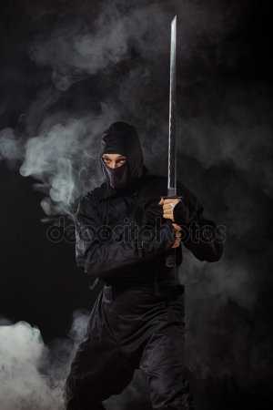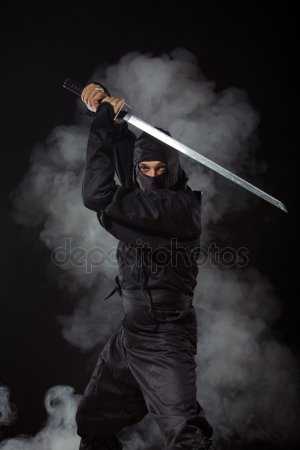 Меч ниндзя (ниндзя – то, гатана) – короткий изогнутый меч с металлической рукоятью, опутанный черными полосками кожи. О мече ниндзя под влиянием боевиков сложилось большое количество заблуждений. Ниндзя–то был не прямым, а слегка изогнутым и не носился за спиной, как показано в фильмах. Во избежание привлечения внимания к наемному убийце на лезвии, ножнах и рукояти отсутствовали узоры, орнамент и драгоценности. Зачастую ножны меча (сая) делали длиннее, чем лезвие и в пустое пространство клали небольшие вещи, которые могли помочь синоби в сложной ситуации – сюрикены, отравляющие порошки, документы.
