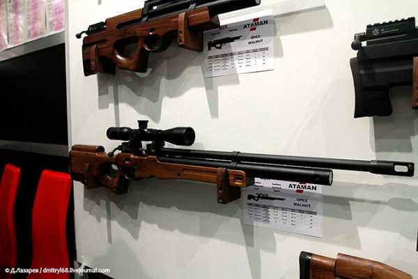 На фото – пневматическая РСР-винтовка (с предварительной накачкой) Атаман М2R производства ООО «Демьян», выполнена по компоновочной схеме «Буллпап», т. е. с затвором и магазином, находящимися позади рукоятки управления огнем, в прикладе. По такой схеме выполнены многие образцы оружия.