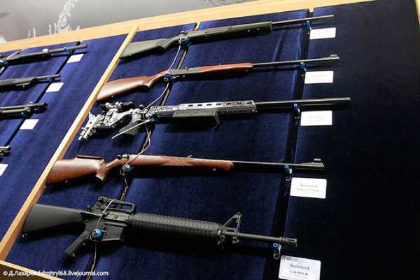 Организаторы этого стенда категорически запрещают снимать эти ружья. На столиках даже лежат значки с перечёркнутым фотоаппаратом. Но, немного поговорив с организаторами, они любезно разрешили мне сделать несколько снимков.
