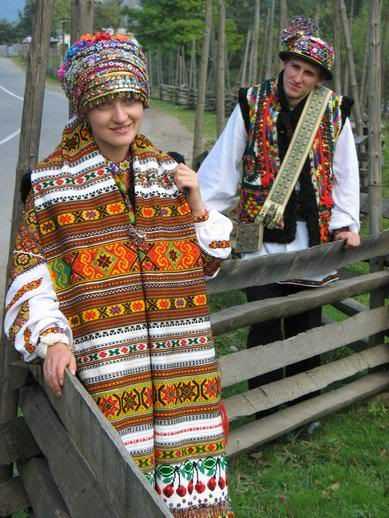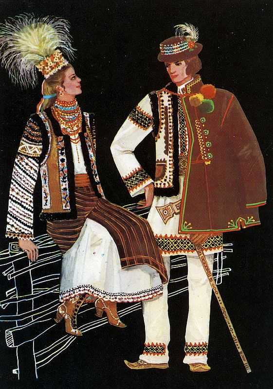 Украинский национальный костюм: 1. Кожух мужской. 30-е гг. ХХ в. с. Лисичники, Залещицкий р-н, Тернопольская обл. 2. Кожух женский праздничный. Нач. ХХ в. с. Корнив, Городенковский район, Ивано-Франковская обл. 3. «Полька с хорьками» свадебная. с. Драчинци, Кицманский район, Черновицкая обл.