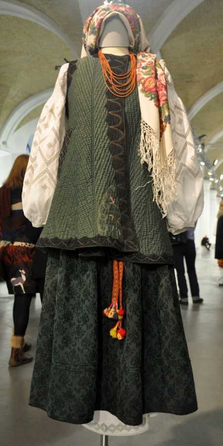 Рубашка из домотканого полотна с узеньким стоячим воротником. Красно-черная и черно-синяя вышивка на груди и рукавах выполнена крестиком. Для мережки по подолу использована серая льняная нить. Зеленая с красными «перчиками» байковая куртка – «юпка» пошита с большим отложным воротником. Запаски, красная передняя и синяя задняя, из домотканой шерстяной ткани с разноцветным геометрическим орнаментом по подолу. Пояс с кистями завязан на левом боку. Вышитый хлопчатобумажный платок затягивался на затылке красной лентой. Украшения: красное ожерелье, ожерелье из янтаря, серьги и кольца. Сапоги красные на высоких «пробках».