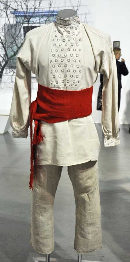 Белая хлопковая рубашка с кокеткой, от которой вдоль груди сделаны мелкие складки — «фальбаночки». На воротнике, пазухе и манжетах полихромная вышивка. Узкие брюки современного покроя.