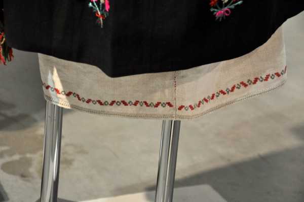 Блузка из фабричной ткани с цельнокройными рукавами. Вышивка на рукавах и пазухе однотонная (черная) или двухцветная (черный с красным). Широкая юбка из яркой ткани, преимущественно с рисунком (цветы, горошек). Подол юбки украшают, как правило, несколькими поперечными складками.