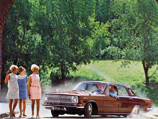 Рекламная фотография ГАЗ-24. Обращает на себя внимание яркий вишневый цвет и красные кружки в выштамповках колесных колпаков