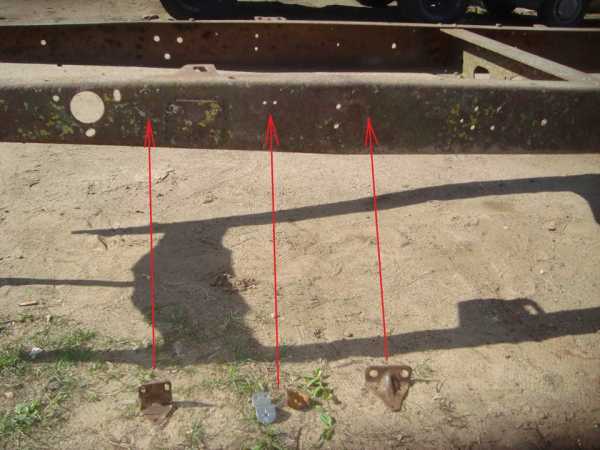 5 — если кто заметил, с рамы срублена почти вся навеска: фаркоп с растяжками, один кронштеин кабины и кузова, площадки для крючков капота, держатели успокоителей передних тормозных тяг, передние кронштеины задних рессор, подножки и еще может что не упомнил… НО у меня почти все имеется, чтобы укомплектовать раму почти на 100 процентов. Только фаркопа нет.