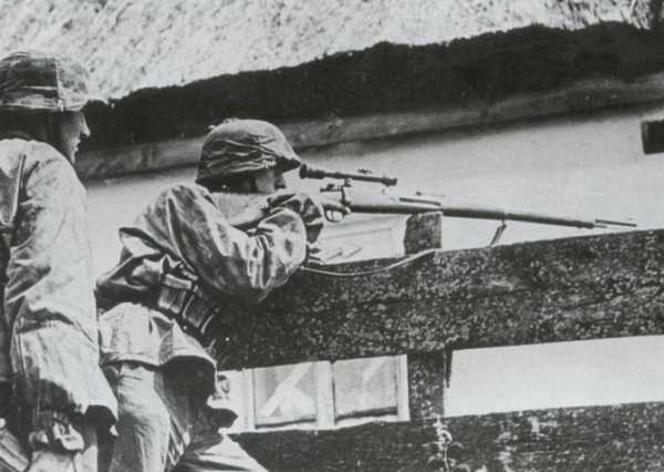 Немецкие солдаты окапываются в начальный период войны. Пехотинец, вооруженный длинной винтовкой «Каг 98к» конструкции Маузера, чувствовал себя стесненный в ограниченной пространстве окопа. Кроме того, во Второй мировой войне дистанция между противоборствующими сторонами сократилась, и дальность стрельбы.