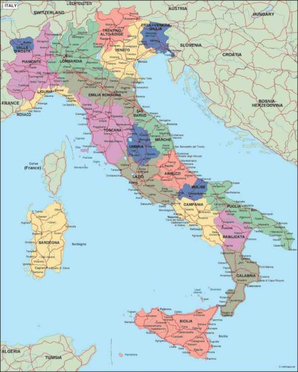 Административное деление Италии. Италия разделена на 20 областей, включающих 94 провинции. Области: Абруцци, Базилика-та, Вале-д`Аоста, Венето, Калабрия, Кампанья, Лацио, Лигурия, Ломбардия, Марке, Молизе, Пулья, Пьемонт, Сардиния, Сицилия, Тоскана, Трентино-Альто-Адидже, Умбрия, Фриули-Венеция-Джулия, Эмилия-Романья.