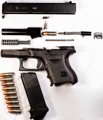 Glock 26 неполная разборкаОружие имеет не высокие показатели начальной скорости и энергии пули по причине малой длинны ствола, в следствии чего, для достижения высокой эффективности стрельбы рекомендуется использовать технику скоростной прицельной стрельбы сериями и применение патронов с современными экспансивными пулями, чего вполне достаточно для быстрой остановки нападающего противника.