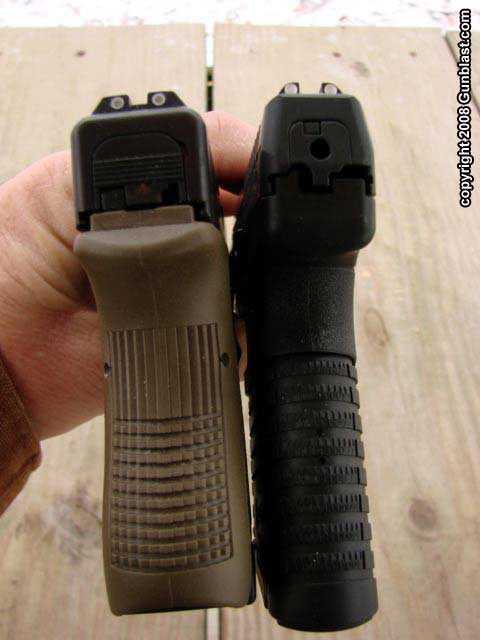 Короткая рукоятка пистолета дает упор только для двух пальцев. Для компенсации этого рукоятка снабжена передними и боковыми выемками под пальцы.