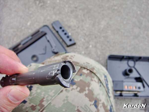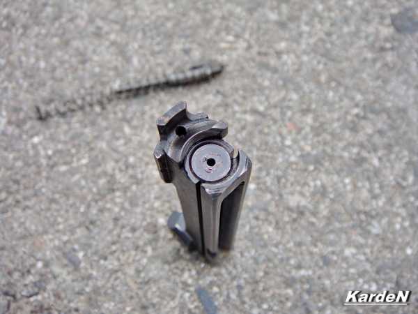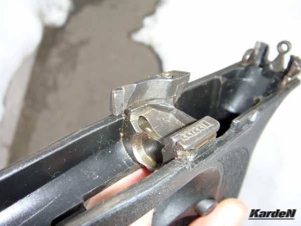 Ствол с затвором отлетели назад с такой силой, что край окна для выбрасывания гильз срезал с передней части муфты ствола полоску металла. Во время расцепления ствола с затвором казенная часть ствола опустилась вниз с такой же силой, что при ударе муфты ствола о выбрасыватель, гнеток с пружиной улетели нахер, а стенка выемки для выбрасывателя на муфте – вздулась…