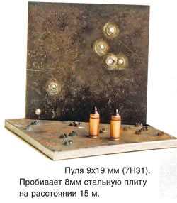 Пуля этого патрона (со скоростью 535-570 м/сек) пробивает на расстоянии 15 м стальной лист толщиной 8 мм, обеспечивая возможность поражения противника, защищенного бронежилетом с жесткими бронеэлементами III категории. Пуля 9х19 мм (7Н31). Пробивает 8 мм стальную плиту на расстоянии 15 м.