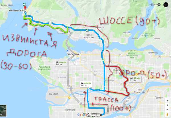 В связи с этим, я садился в Хеллкэт не с мыслью: «Он покажет на что он способен, но и я кое-что покажу» (С), а наоборот. Я сразу решил, что буду ехать именно так, как ехал бы на любом другом автомобиле, а главное что маршрут это позволял. Изначально машина с аукциона должна была отправиться на паром, где я бы отдал ключи представителю авто-дилера, а оттуда в небольшое местечко под названием Нанаймо. Но чтобы доехать до парома, вот ведь везение, нужно было проехать как город, так и шоссе, а после я сам мог свернуть на мой любимый участок извилистой дороге, проходящей по кромке берега западной части города. Таким образом я посмотрю как машина, в стандартных скоростных режимах, будет себя везти в городе, на трассе и на серпантине. Поехали.