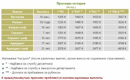 Начальный оклад — 1043 евро в месяц с бесплатным жильем и пищей. Дальше оклад увеличивается в зависимости от выслуги и места службы. К примеру, капрал (3 года службы), который служит во Франции, получает 1226 евро. А капрал, который служит в Джибути, — 3626 евро.